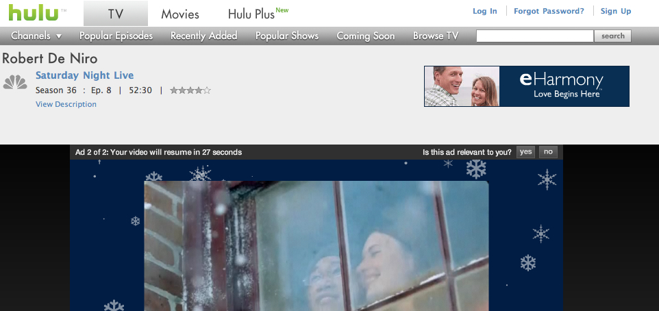 While the reasons that I don’t own a TV do include that I’m too cheap for cable and that I like the feeling of superiority I get when reporting my television-free existence, the primary motive by far is that I can’t stand commercials. I know, I’m a marketing person or whatever, so I shouldn’t say that, but I believe that the current format of TV commercials is on its way out. This delightful assumption is due almost entirely to the fact that the current format of how we watch TV is also about to exist stage left.
