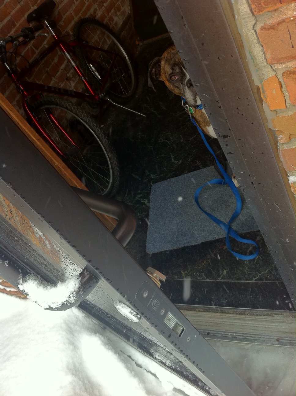 We went out the front of our building, naturally, where the stairs are indoors and less life-threatening, and once outside we slipped and slid down the sidewalk together. Gunshy, confused by the condition of the sidewalk, peed on it – long before we were close to any snow or (frozen) greenery. Ah well, it was a little embarrassing to have my dog peeing inappropriately in my busy downtown, but whatever. When the rules of the sky and the Earth become slightly suspended, we can all feel free to suspend our own rules a bit too, right?
