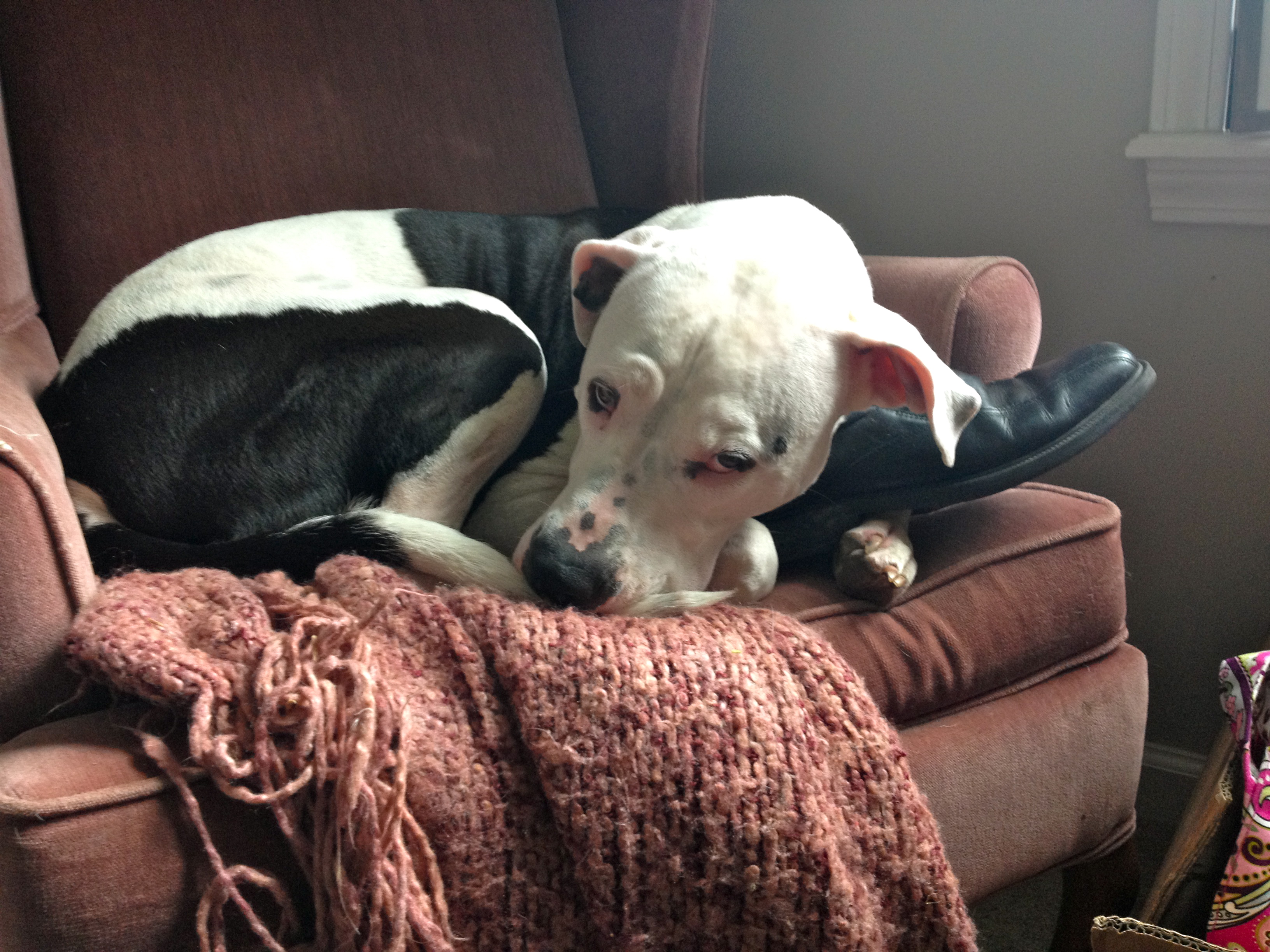 But we didn’t freak out. We noticed, rather quickly, that Lois had, in fact, picked up Mike’s fancy shoe so she could cuddle with it, and there wasn’t a scratch on it. Which isn’t half as naughty as it is totally adorable. No new shoe needed; Mike is on time for his gig; I’m already back to work.