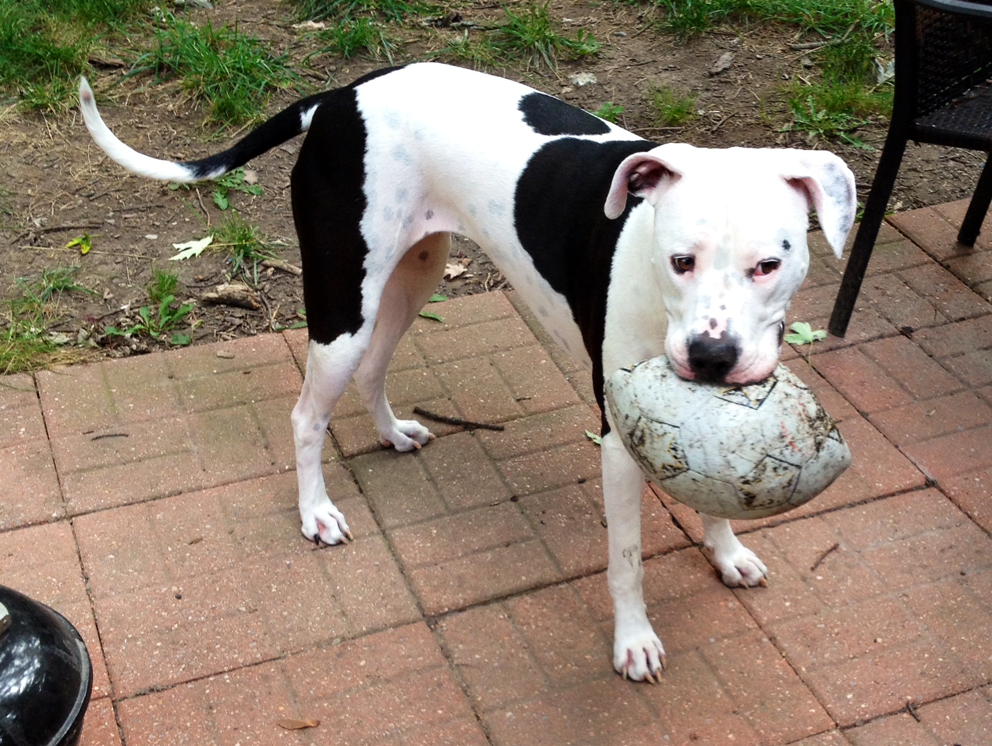 It was a pretty big day for Lois. On her morning walk with Mike to the place we call the Magical Toy Forest, she found an exciting new toy. Now, Lois find toys there all the time, hence the clever name. But today she found a particularly thrilling deflated white rubber soccer ball, and the two have been inseparable ever since.
