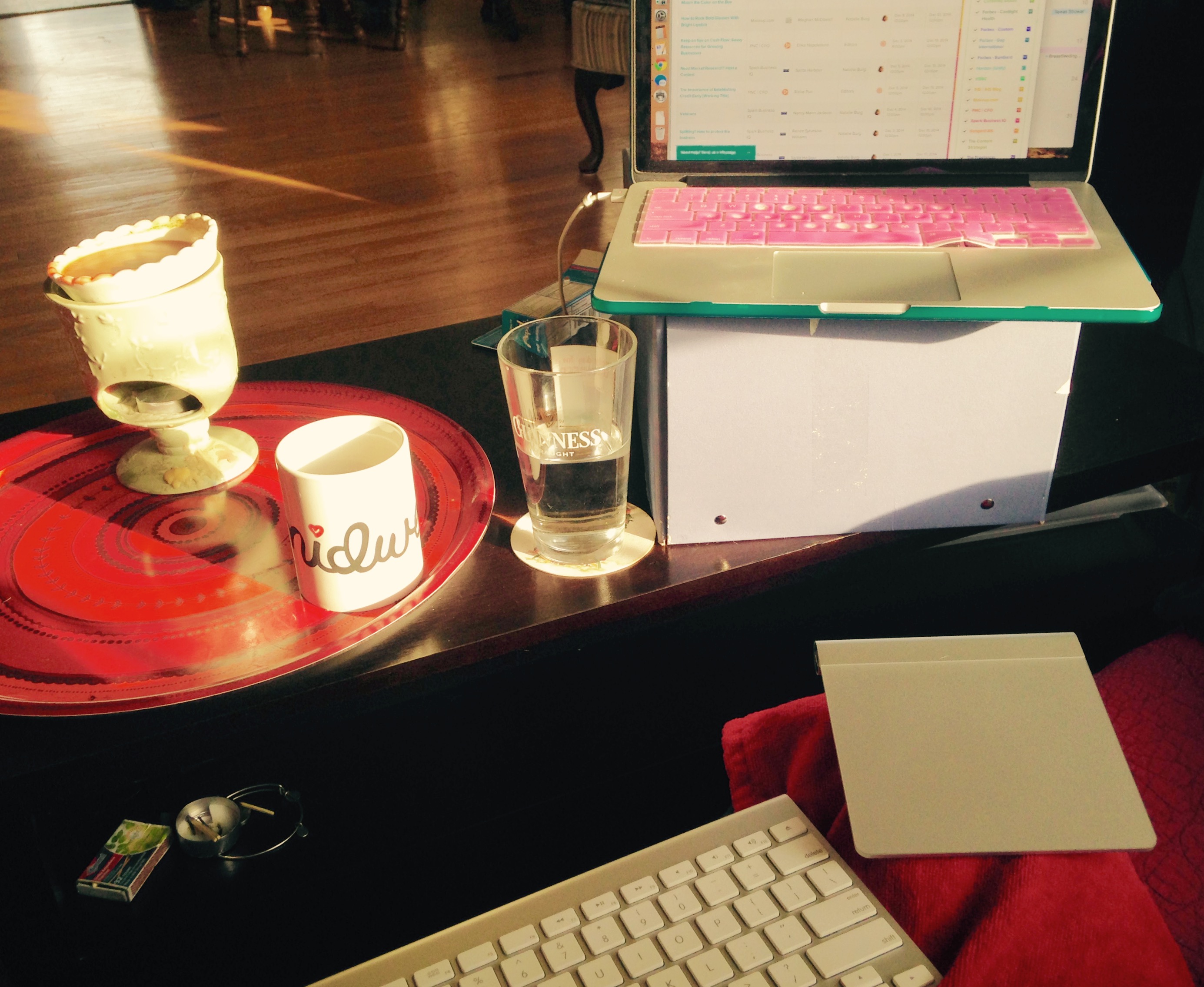 - My laptop is propped up on a upside-down file box (that surely I will soon decorate to be pleasing to my eyeballs) on either my desk or the coffee table in my living room so my head can stare straight ahead. Yes, I have to zoom my screen in at times to see small writing. Yes, this does bring me some weird amount of shame.