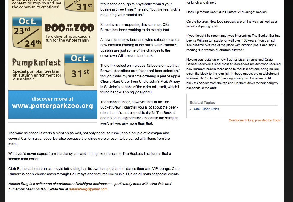 - Lansing State Journal, “Bar Spotlight,” Review of Local Bars, Feature Articles, “What’s On” Section – 7/04 – 9/05 & 6/09-12/09